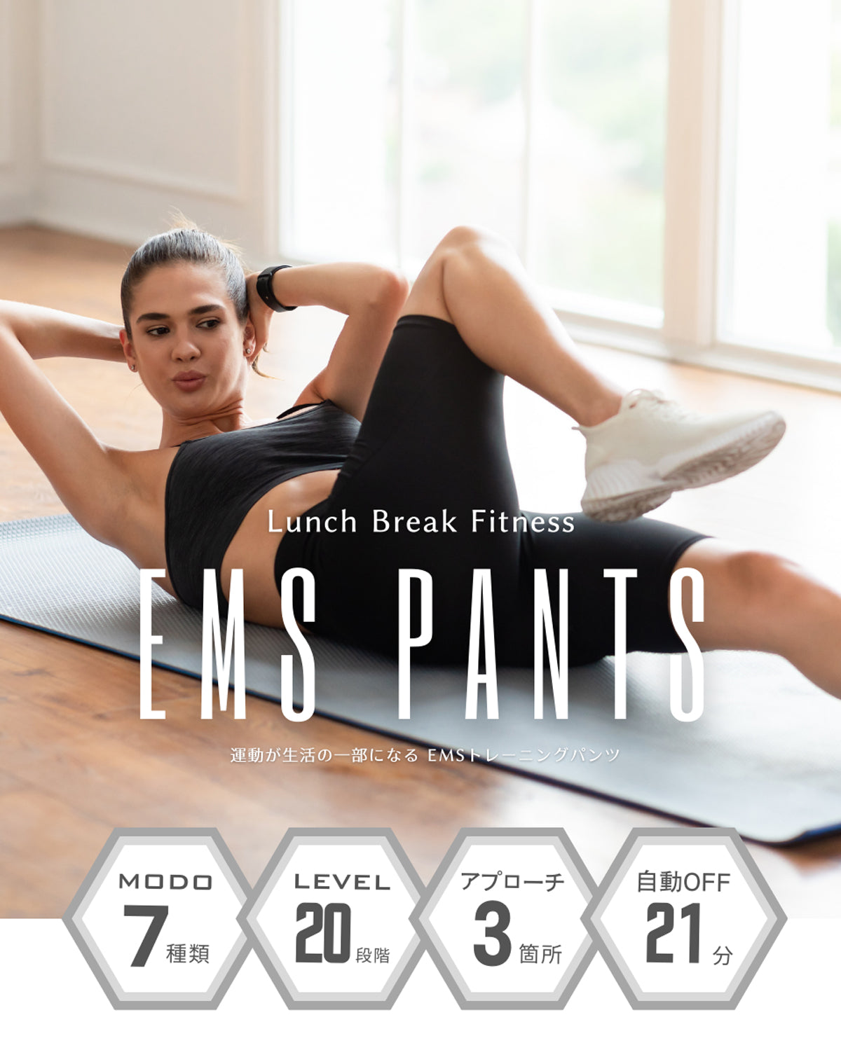 Lunch Break Fitnessはランチを食べるように、誰でも・モチベーション0でも運動が出来るように開発しました。歯磨きをしながら、大好きな映画を見ながら、通勤電車で、スマホを見ている時間も・・・あなたは自然と運動不足の罪悪感から逃れることができます。普段から運動をしている方にはもちろん、運動が苦手な方や体を動かすことが難しい方でも継続できるEMSパンツです。
