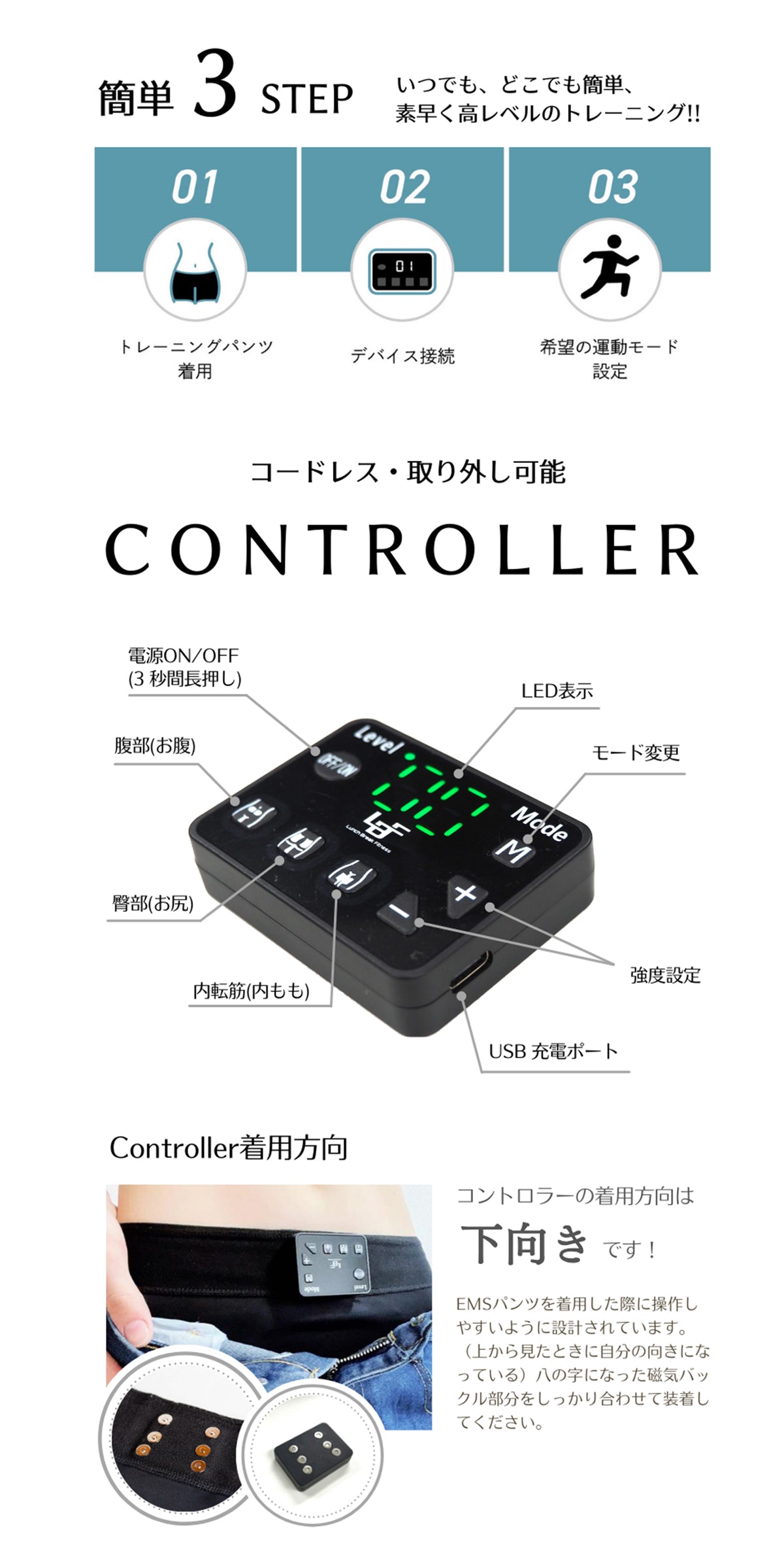 この製品は着用前に水を吹きかける必要がなく、下着のように1 日中着用し、好きな時にトレーニングできるEMSパンツです。いつもの服の下に着用することで、着替える必要もなくコントロラーを装着すれば、時間も・場所も選ばず運動する事ができます。
